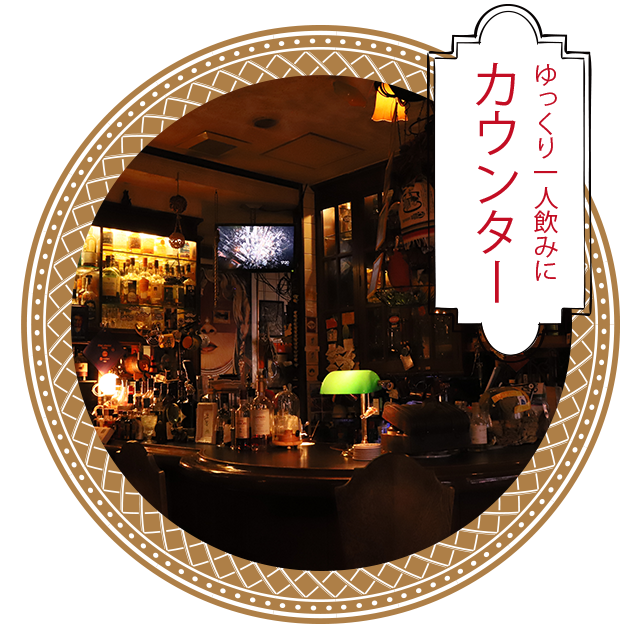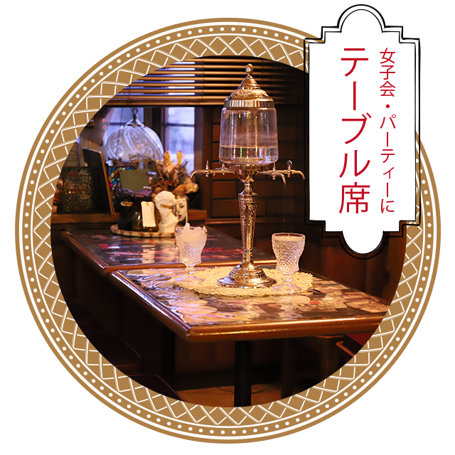 お仕事帰りにお薦めの立ち飲み席や、 じっくり愉しみたい方向けの カウンターの他、 女子会などにもご利用いただける テーブル席を完備。 純喫茶のようなレトロな空間で、 癒しのひとときをお過ごしください。